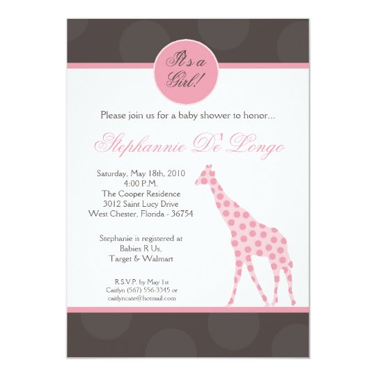 Sweet baby shower with pink polka dot fabric accents, giraffe cookies, giraffe cupcake liners, apothecary jars & cupcake stand take a look at this adorable pink giraffe baby shower submitted by rene bross of my good greetings. Download, print, or send online (with rsvp). Invitation, baby, card, template, baby shower, pink, invitation card, cute, new, baby girl, giraffe, shower, baby card, cute girl, lovely, new born, horizontal, born Giraffe baby shower invitations sprinkle invites chevron stripes grey gray polka dots yellow orange jungle safari customized gender neutral product description. Free printable baby shower invitation templates that you can customize in minutes.